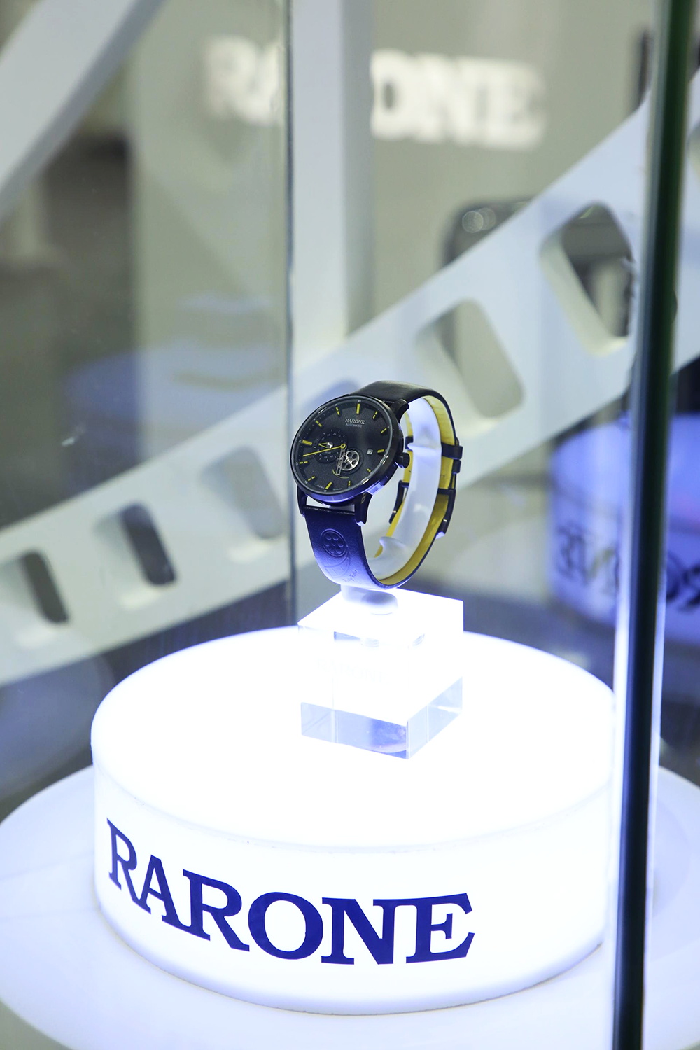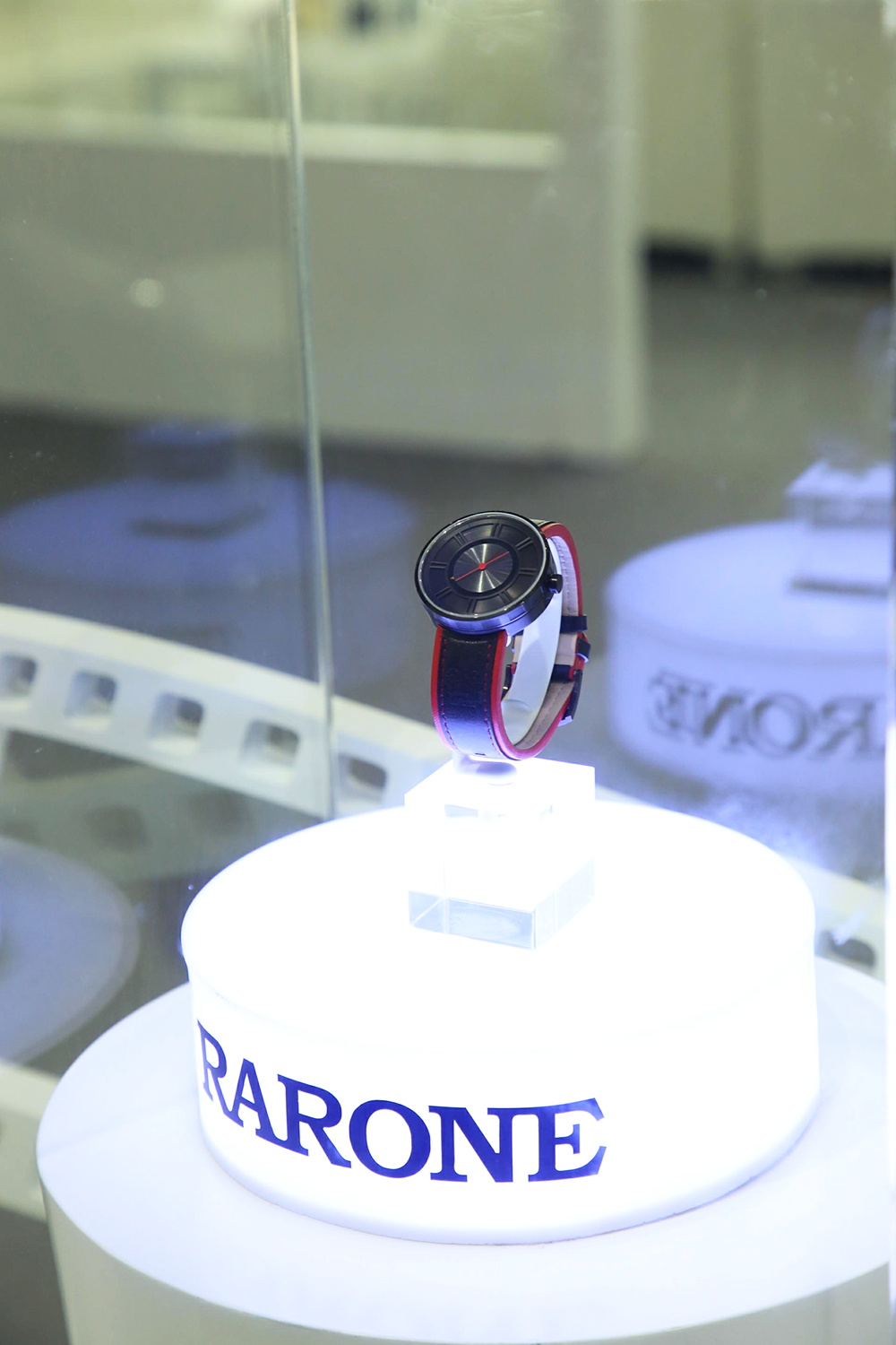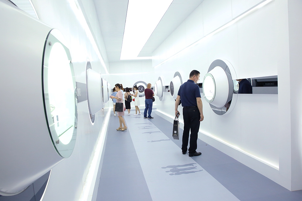 今年的雷諾表展館展臺以波浪形的表帶及表盤合成抽象的圓形表盤,并配以燈光,極具視覺沖擊力,白色的線條猶如鋼琴的琴鍵,流暢而優(yōu)美,環(huán)繞展臺四周,時間與優(yōu)雅的生活完美融合,并在入口處設置時光隧道,光影穿梭,引領全新的商務體驗和潮流。展館內(nèi)的流水幕墻,寓意著時光的流動完美融合其中,展示效果更為生動。