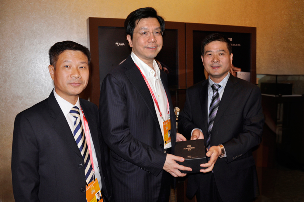 雷諾表業(yè)董事長(zhǎng)詹西洲、總經(jīng)理詹江洲親自贈(zèng)送博鰲紀(jì)念表予李開復(fù)博士(中),并合影留念