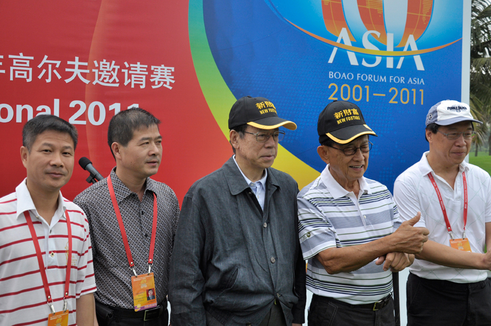 雷諾表業(yè)董事長(zhǎng)詹西洲先生(左一)、總經(jīng)理詹江洲先生(左二)與博鰲亞洲論壇理事長(zhǎng) 日本前首相福天康夫(中);博鰲亞洲論壇前任前理事長(zhǎng)、菲律賓前總統(tǒng)拉莫斯(右二)一同參加博鰲高爾夫邀請(qǐng)賽